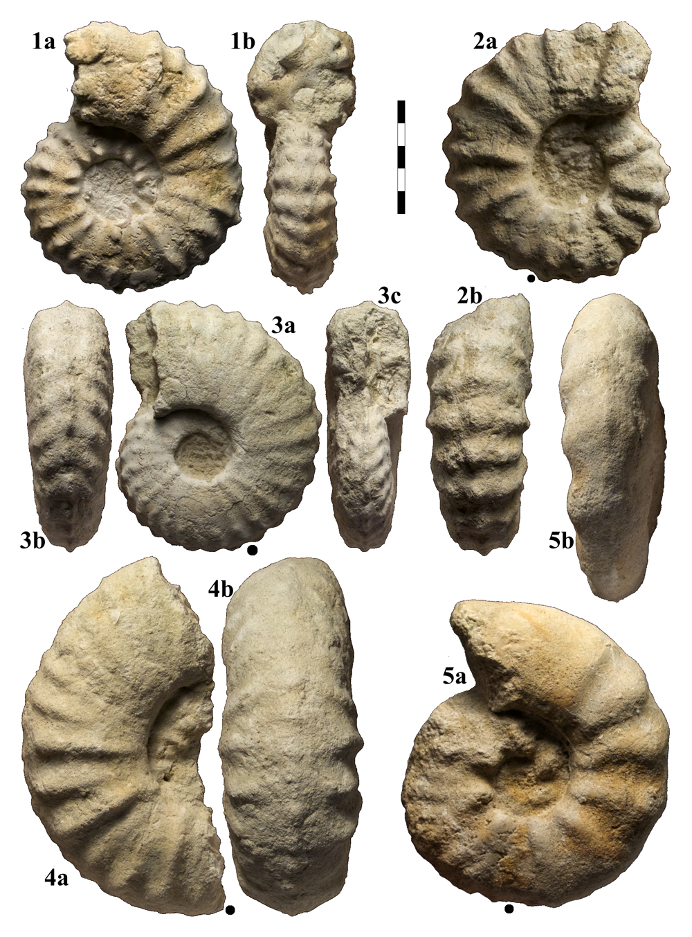 Fig 5 : Collignoniceras vigennum Amédro & Châtelier sp. nov., holotype, IGR-94984 (coll. H.Ch.), de la carrière "des Bruns de Marigny-Marmande", base du Tuffeau Jaune de Touraine (base de l'unité 5, récolté en place 60 cm au-dessus de la limite de banc), Turonien moyen, zone à R. ornatissimum, biohorizon à R. marigniacum (Tm 3 sommital).