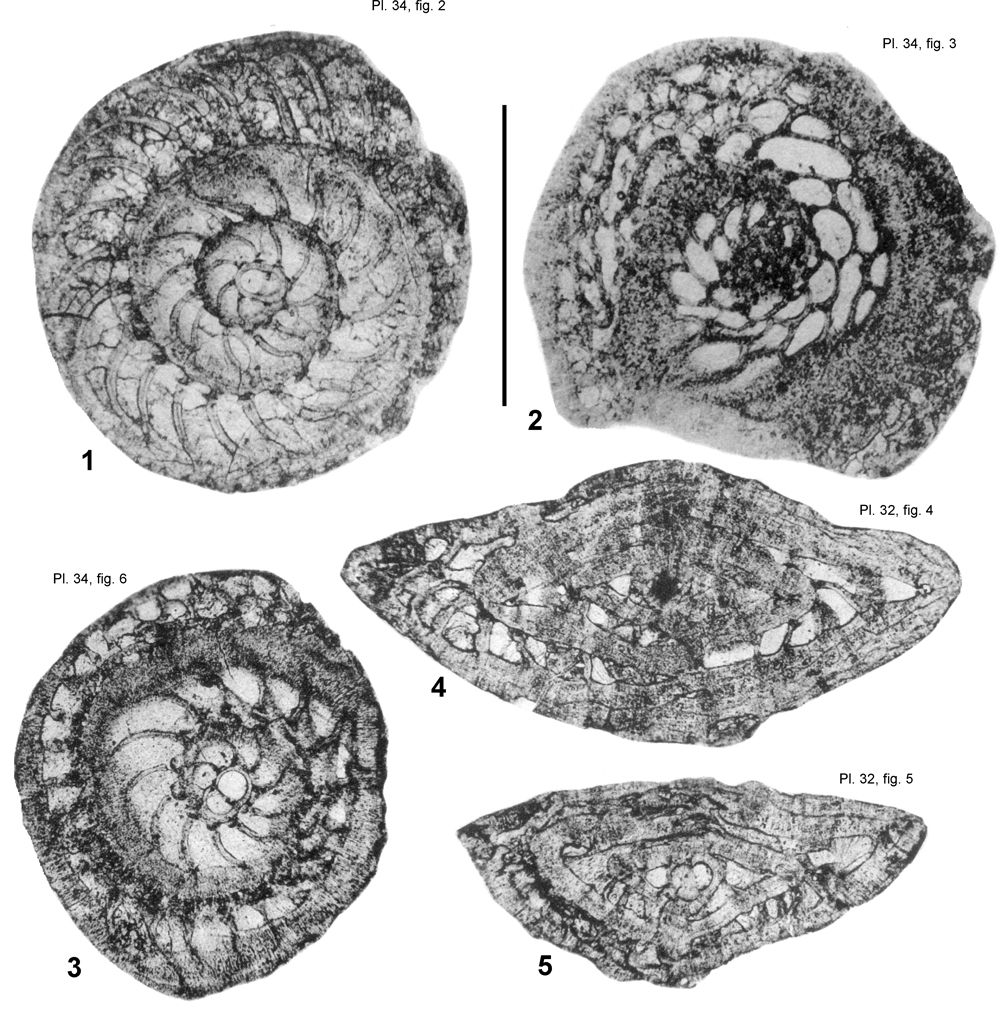 Figure 28: Reproduction of the original illustrations of Helicostegina gyralis from Barker & Grimsdale (1936). 1 (Pl. 34, fig. 2), equatorial section. 2 (Pl. 34, fig. 3) section cut on ventral side of the equatorial plane showing ventral sheet of chamberlets. 3 (Pl. 34, fig. 6), equatorial section. 4 (Pl. 32, fig. 4) axial section. 5 (Pl. 32, fig. 5) axial section. Note that in 4 the ventral chamberlets extend into the periphery of the test, whereas in 5 they do not. Guayabal Formation, Jenny Section No. 1573, 11 km southeast of Sabaneta, state of Veracruz, Mexico. Scale bar = 1 mm.