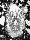 allochem, within which calcite fibers (i.e., the 'fibrite') have grown. This